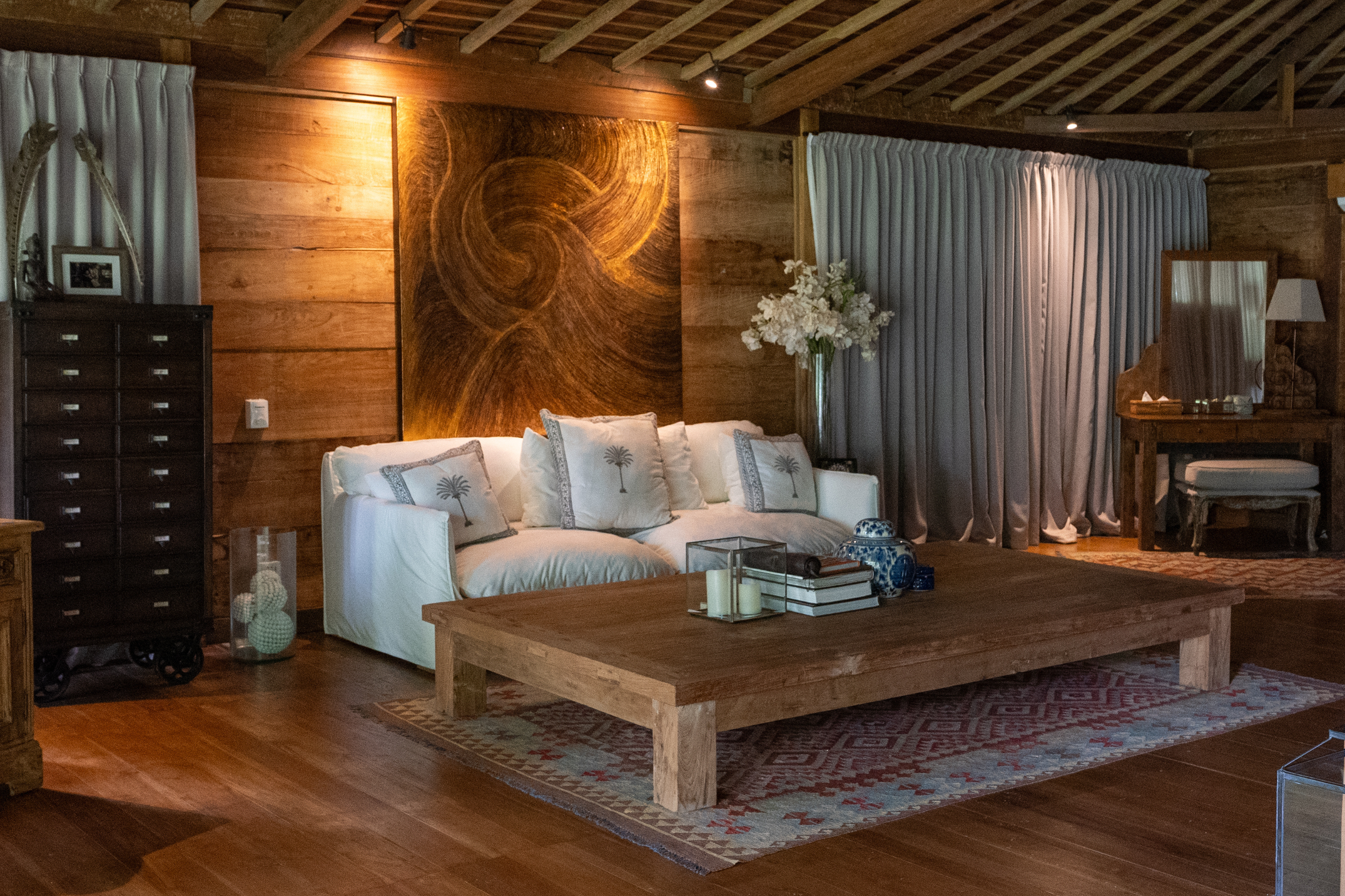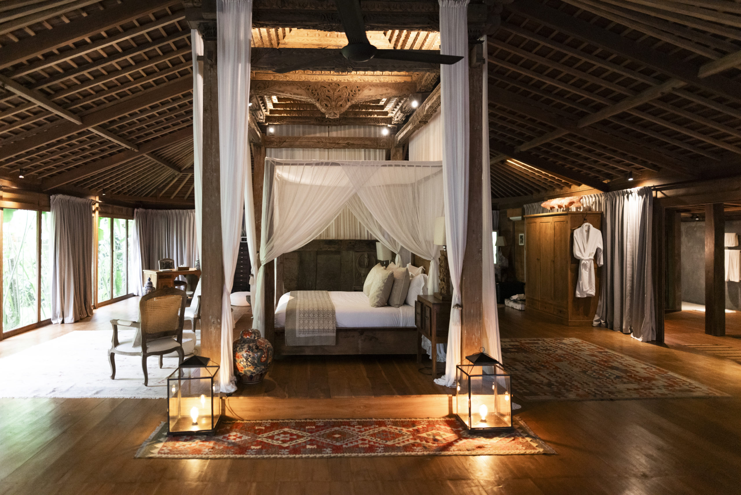 Istana, which means “palace” in Indonesian, embodies the regal quality of its namesake. Housed within a modern Joglo-style structure, the Istana Suite features an antique Javanese carved ceiling, billowing gossamer curtains, carefully chosen furnishings and floor-to-ceiling windows, creating an atmosphere of effortless elegance. Persian rugs are strategically placed to section the areas for lounging, writing and relaxation.