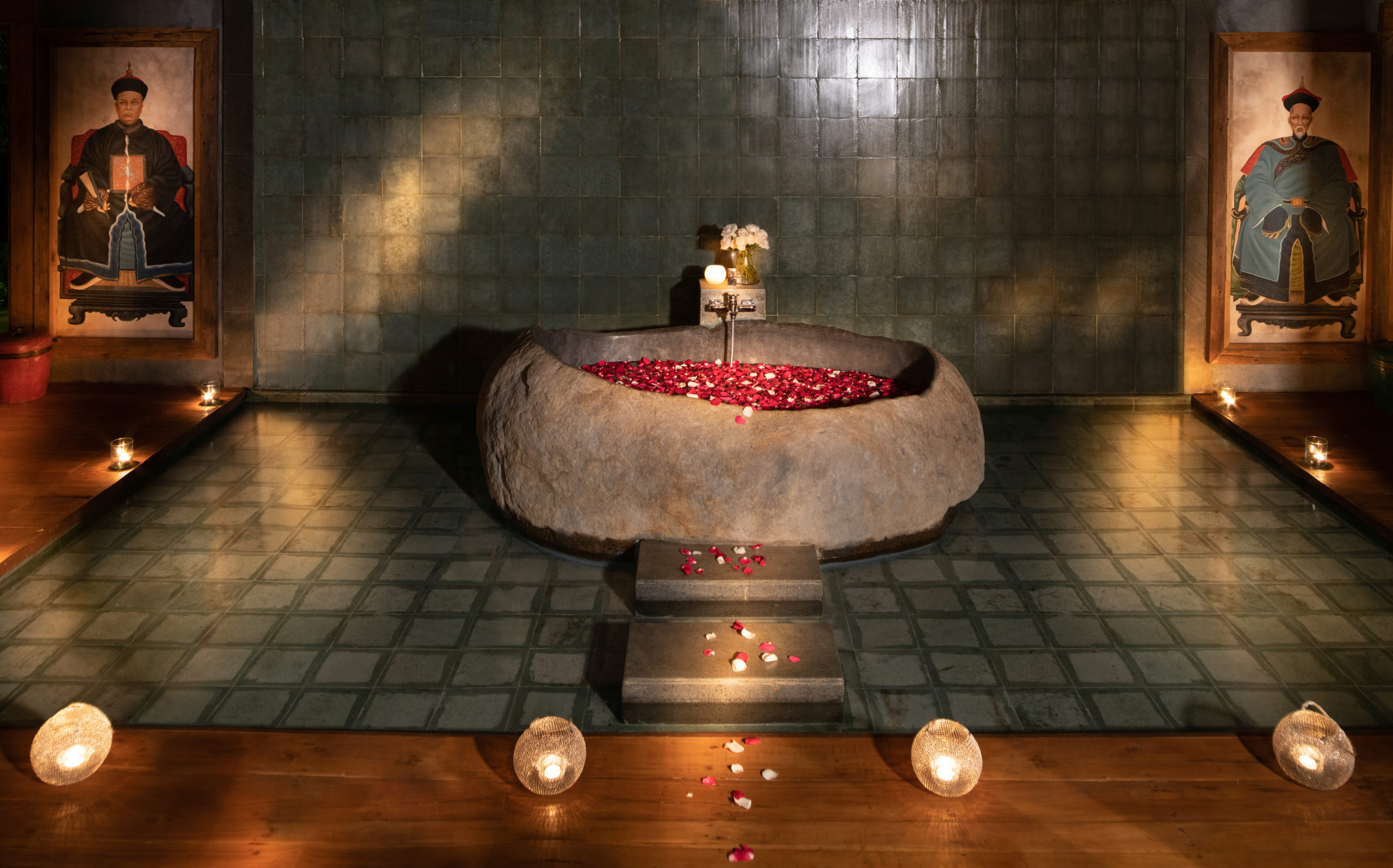Placed on a raised platform, the stately king-size bed is the centrepiece of the suite and is surrounded by soft curtains. The huge ensuite bathroom is just as impressive and has a tranquil spa-like setting; flower petals, optional. It houses an imposing stone bathtub set in a pond, and accompanied by two large rain showers and separate vanity areas.