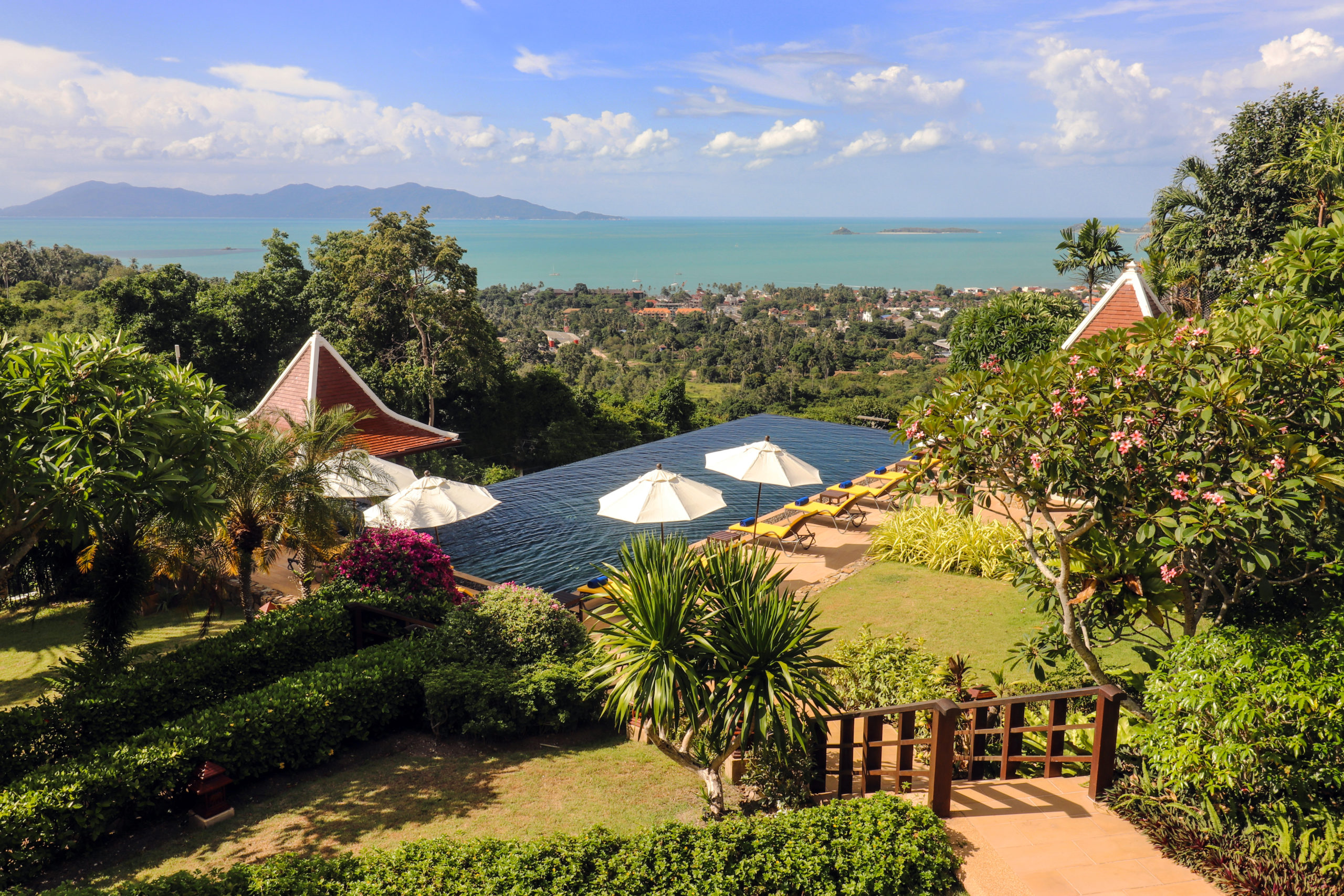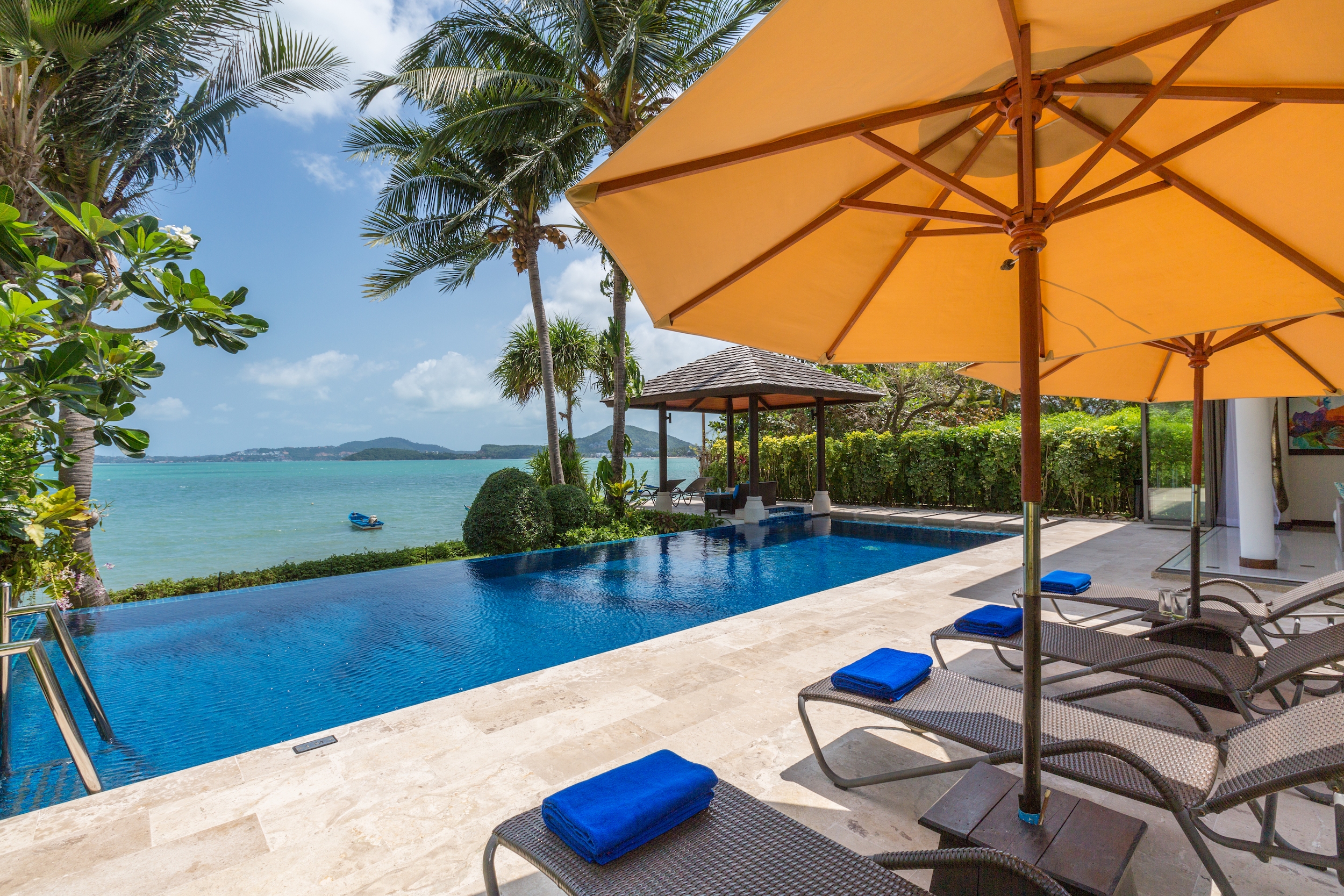 Just a short drive to Fisherman Village, Ban Kinaree is right in the heart of the tranquil Bophut hills — one of our favourite locations on the island. This five-bedroom hillside getaway is sprawled across three separate pavilions and levels, and balances traditional Thai architecture and modern tropical design. Highlights of the villa? A massive infinity-edge pool with expansive mountain and sea views, generous sleeping quarters, grand bathrooms fitted with both outdoor or rain showers and large bathtubs, and a front row seat to Thailand’s breathtaking sunsets.