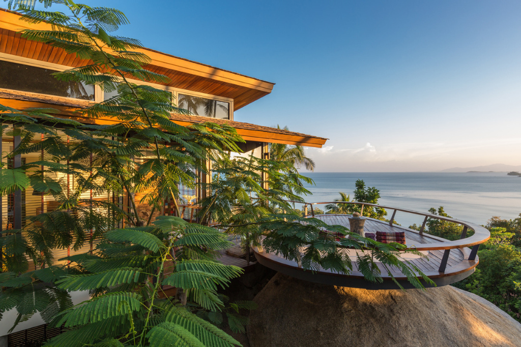 For panoramic views across the Gulf of Siam, look no further than this extraordinary hillside villa in Laem Set. The four-bedroom property has a breathtaking 180-degree view of the ocean and living spaces that uniquely follow the natural slope of the hillside. Guests can explore over four storeys of chic designer furnishings and art-filled spaces, leading down to a deck complete with a plunge pool, waterfall and sunbeds. Floor-to-ceiling glass doors invite the outdoors in, and when you finally head in for the night in any of the four stylish ensuite bedrooms, make sure to take in the evening breeze from the private balcony.